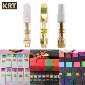 KRT Ceramic Vape Carts 0.8ml 1.0ml Gold Ceramic White Atomizers With Packaging 10 Strains Sticker 510 Thread Premium Thick Oil Dab Cart Cartridges