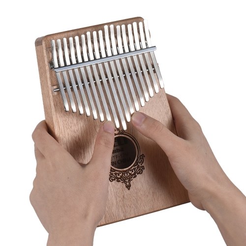 Mahogany veneer kalimba with simple design and exquisite workmanship; triple sound holes and 17pcs metal tines, warm tone and excellent sound quality.