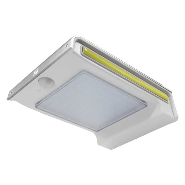 Smart silver colour: A superb light for mounting above doorways, entrance areas and close to pathways. Great for home and work uses, lighting the way to your front or back doorway, garage or shed etc. etc. This superb (bright white 6500K) light also helps improve security by lighting darker areas. Mounting the unit is both easy and quick: simply use 2 of the screws provided to mount the 8x3cm mounting plate. The unit then simply locates onto the plate. Unit only weighs 262 grams in total. 3 Mode: The light will automatically turn on in DIM mode in darkness or at night, when motion is detected it will stay on full power for as long as it continues to detect movement, the light will go back to dim mode when there is no motion and stays on as long as there is enough power in the battery. Ideally mount the unit in a bright area where there is plenty of daylight. The solar panel will still charge the battery in low light or on a cloudy day but will not provide light for as long of course! 🙂 Use the supplied pin to manually turn on or off the light in the slot next to the PIR sensorSpecificationsHigh Efficiency Solar panel:1.6W / 5.5v measures 8×11.5cmWattage:5.5WOutput in Lumen:450 Lumen – 6500K LED colour light – a clean/pure white light that is close to daylight.LED qty:72pcs with 2 additional 13cm COB panels for general / side lighting. High Quality Li-ion Rechargeable Battery (fitted): 3.7V 2200mah high capacity – note that if you remove the 8 small screws you can access the internal area of the light and if required the Li-Ion 18650 battery can be replaced. It is not soldered in place so if the battery does stop working then this is useful to know. Many other units do not give you this “replaceable” option!Protection Level: IP65Sensing Distance: 0.5 to 5MBright light mode Delay time: 30 seconds – remains on bright mode if it see’s continued movement.Installation Type:Wall MountedMotion Sensor angle 120 Degree points downward.3 Modes: Off / On with low light sensor, motion sensor activates bright modeDimensions L17.5  x  W11.5 x H4cmTotal Weight: 262 Grams (with battery fitted)Whats in the Box: LED and COB outdoor solar light unit with built in 18650 Li-Ion rechargeable battery 2 screws and rawl-plugsPin for turning unit on or off.