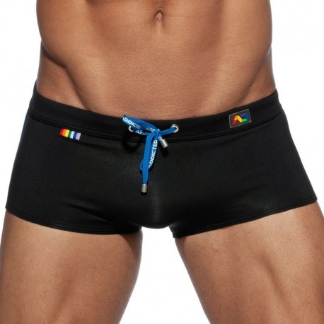 Low-rise swim boxer. Sexy and fitted cut. Removable Pack Up foam system to enhance your masculinity. Rainbow back pocket. Contrast side piping. Elastic waistband with drawstring. Rainbow Addicted logo and label. Made in Barcelona.