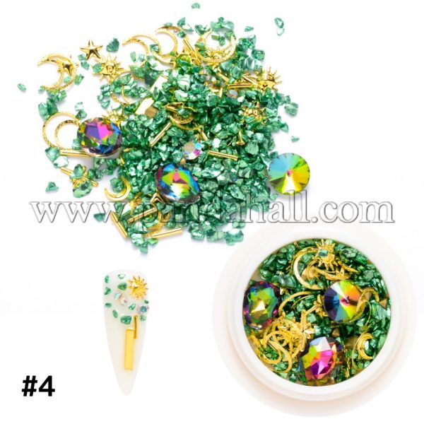 ail Art Decoration Accessories, with Resin Rhinestones & Golden Tone Brass Cabochons & Glass Chips, Mixed Shapes, GreenSize: about 1~10mm long, 1~10mm wide, 0.5~5mm thick; box: 4×1.7cm; package size: 11x7cm.