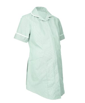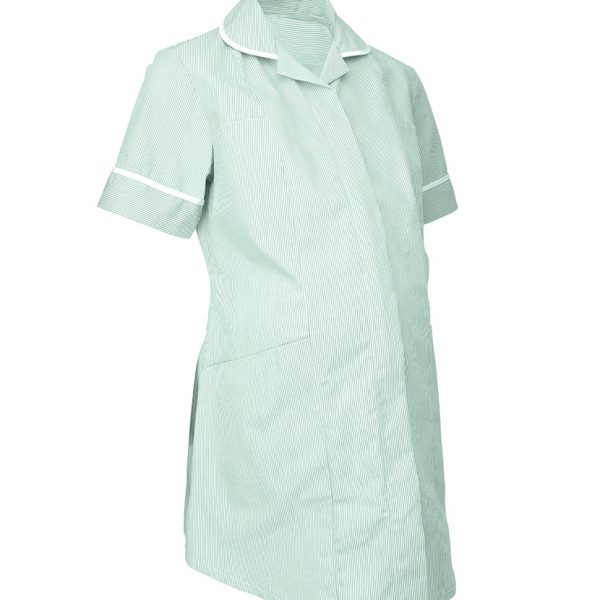 Woven stripe fabric with concealed zip frontTwo hip and chest pocketsDouble action back and vents195gsm 67% polyester/33% cottonMachine washable and industrially launderableCentre back length: 75 – 81cm (increases with size)