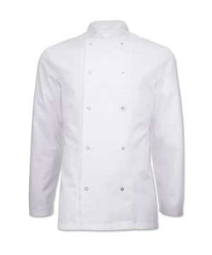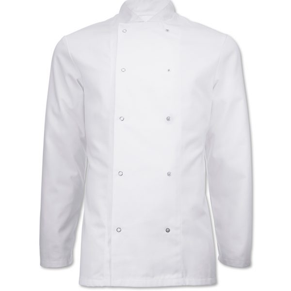 Unisex fitMandarin style stand collar10 silver ring stud fasteningReversible front fastening275gsm 50% cotton/50% polyesterMoisture wickable fabricUp to 85° washSuitable for industrial laundrySizes XS – 4XLBack length 73 – 80cm (increases with size)
