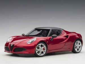 This Alfa Romeo 4C Spider Composite Model Car is Competition Red and features working wheels and also opening doors. It is made by AUTOart and is 1:18 scale (approx. 22cm / 8.7in long).
