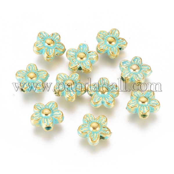 Alloy Beads, FLower, Golden & Green PatinaSize: about 9.5mm wide, 8.8mm long, 4.5mm thick, hole: 1.6mm.