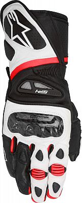 Highly durable and technical premium 1.3 leather, multi-panel construction for superb abrasion resistance, with reinforced stitching for optimum tear resistance and strength. Innovative multiâpanel construction incorporating strong and supple leather main chassis. Palm and outer edge of hand reinforced with Clarino® suede for abrasion resistance and support. Poly-foam padding on fingers, thumb and wrist for improved fit and additional impact protection. Lightweight, durable carbon fiber knuckle guards offer superb protection against repeated impact. TPU palm slider for excellent abrasion resistance and protection in critical impact area. Large air exhaust vent on back of hand features TPR ridge for additional abrasion resistance. Alpinestarsâ patented third and fourth finger bridge prevents finger separation and limits finger contortion and burst seams. Leather accordion flex inserts on fingers and thumb provides support, fit and comfort. Perforated cuff, leather top panel and ventilated finger sidewalls keep the hands cool aiding comfort. Thumb, fingers, palm, top of hand and wrist are padded with 4mm perforated polyâfoam for extra cushioning and comfort. Gauntletâstyle cuff includes an elasticated wrist and a double Velcro® closure for a secure customized fit. Anatomical, preâcurved finger construction helps prevent fatigue and improve riding comfort. Leather reinforcements cover fingers and sidewalls for durability. Touchscreen compatible index fingertip for ease of use with smartphone and GPS.