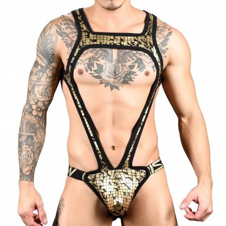 Sexy and provocative singlet combining a harness and a jockstrap. Shimmering gold and black design. Almost Naked anatomically correct pouch with fun snuggle fit. Contrast trim. Branded elastic waistband. Limited Edition.