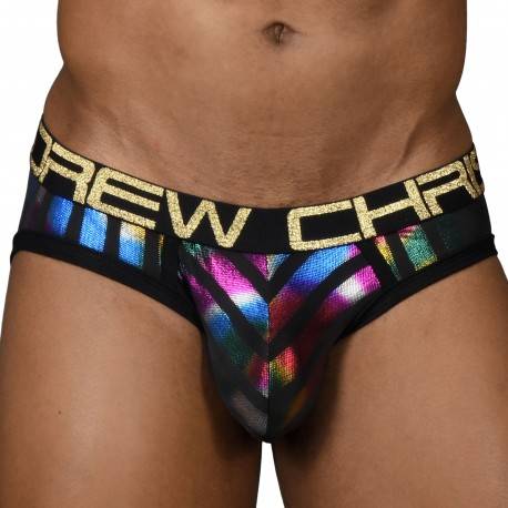 Low-rise brief made from microfiber with a shimmering, iridescent print. Almost Naked anatomically correct pouch with fun snuggle fit. Andrew Christian slimming elastic waistband with gold lettering. Limited Edition.
