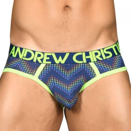 Sexy brief made from soft, lightweight and comfortable microfiber. Electric chevron design in bright rainbow colors. Extra flattering and low-rise cut. Almost Naked anatomically correct pouch with fun snuggle fit. Neon detailing. Andrew Christian slimming elastic waistband. Limited Edition.
