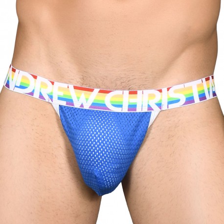 Sporty and sexy jock made from lightweight and breathable sports mesh. Elastic waistband ans straps in rainbow colors. Almost Naked anatomically correct pouch with fun snuggle fit. Contrast detailing. Limited Edition.