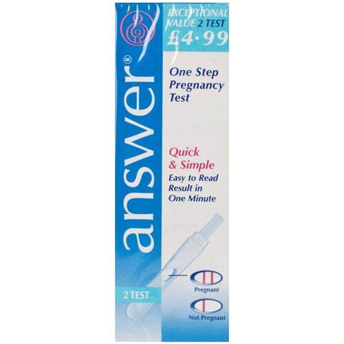 Answer Pregnancy TestAnswer Pregnancy Test is an easy to use home pregnancy test that gives you results in just 1 minute. Simply hold the absorbent end of the test in your urine stream for a few seconds, then after a minute check the easy to read result – two lines pregnant, one line not pregnant.Answer Pregnancy Test works from the first day of a missed period and is over 99% accurate in laboratory testing.