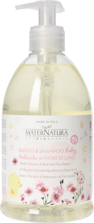 Mild care for delicate baby skin Practical shampoo & wash, ideal for daily use and for the first months. It gently cleanses hair and skin respecting the physiology of the skin of babies and young children. Gentle, moisturising and pleasant, it nurtures skin with cleansing substances selected for their gentleness and biodegradability. Their pH is perfectly tolerated even by newborns’ skin. Extracts of organic calendula and chamomile provide an intense repairing treatment thanks to their natural moisturising and soothing action. Linseed oil and mallow leave the skin moisturised and smooth, effectively protecting it against irritations and redness. Tear-free and naturally scented shampoo & wash for easy to comb hair; for a clean, pampered and happy baby. Application: Pour a small amount of product into the bath or into your hand. Gently massage to create a soft lather, then rinse thoroughly. Warning: Avoid contact with eyes; in case of contact with eyes rinse immediately with water. Keep out of reach of children. Do not expose to sunlight. Store at room temperature. The MaterNatura baby care products fare free of Parabens Paraffin SLS and SLES DEA GMOs and animal ingredients Moreover, this product is nickel tested (