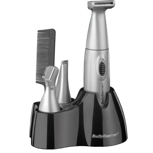 Precision trimmer for neckline, sideburns, beard and moustache outlining and trimming The precision trimmer is ideal for trimming the neckline and sideburns. It can also be used to maintain a beard or moustache. The trimmer is supplied with two five-position comb guides for length control (1 to 20 mm). To adjust the length of the comb guide, it is as simple as sliding the button on the top of the comb guide up to the appropriate length. Each position increases the length by 2 mm (position one equals 2 mm and position ten equals 20 mm). Keep your eyebrows in shape Keep your eyebrows out of your eyes with a quick trim using the eyebrow trimmer attachment. It is supplied with a comb guide that has two length settings, short and long, to suit your requirements. Use the longer setting at first, until you become familiar with the adjustments. Use the trimmer without the comb guide to shape and define your brow. Easy trimming of nose and ear hair The 6-in-1 Grooming Kit also has a nose and ear hair attachment. It is simple to useâsimply insert the trimmer head into your nose or ear and trim the hair by moving it in a circular motion. The trimmer should only be used at the entrance to the ears or nose. Use any deeper than this can cause injury. Convenient storage stand The BaByliss For Men 6-in-1 Grooming Kit for men comes with a storage stand that is able to hold the trimmer and all three trimmer heads along with the comb guides, the cleaning brush and the barberâs comb. Cleaning and maintenance To maintain optimum performance of your trimmer, it is important to clean away any loose hairs that have collected in the trimmer after each use. A cleaning brush is provided to assist with this task. BaByliss For Men BaByliss For Men is manufacturers of electrical male grooming appliances. BaByliss tools are used in hair and beauty salons and BaByliss use this expertise to create top performance products. All BaByliss For Men products are thoroughly tested to give the ideal performance and results at home.