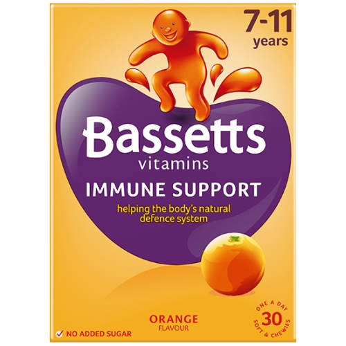Bassetts 7-11 Years Immune Support Orange FlavourBassetts 7-11 Years Immune Support Orange Flavour are a delicious soft and chewy supplement containing vitamin C and zinc to boost the immune system of seven to eleven year olds so they will be ready for anything.Immune System: Vitamin C and Zinc help support the immune system.Vitality: Vitamin C helps reduce tiredness & fatigue and contributes to the release of energy from food.Nervous System: Vitamin C helps support the working of the nervous system.Wellbeing: Zinc supports normal cognitive function.Bassetts 7-11 Years Immune Support Orange Flavour are made with natural colours and flavours and are free from added sugar.