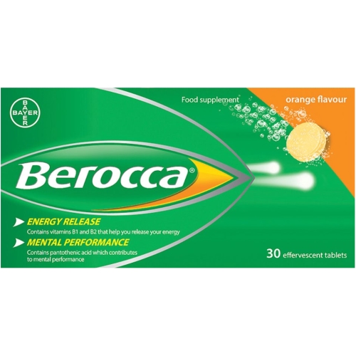 Berocca Effervescent 30s When you feel you need more energy it’s tempting to grab a coffee or a bar of chocolate. But the quick fix you get from caffeine and sugar doesn’t last long and can leave you feeling worse a few hours later. The same goes for energy drinks that are often loaded with sugar and artificial stimulants. A healthier alternative would be to choose some fruit. Berocca Effervescent Tablets are packed with B vitamins, vitamin C, and essential minerals, Berocca is designed to help your body release energy from food and support a healthy immune system. What’s more, its unique high-dose formulation could help support concentration and alertness making it a healthy alternative to caffeine and artificial stimulants. If you’ve tried other nutritional supplements and found the taste a turn-off, you’re in for a pleasant surprise as an effervescent Berocca tablet dissolved in a glass of water makes a refreshing orange-flavoured drink most people really enjoy.Nutritional InformationAverage ValuesPer tabletRDA Vitamin C 476 mg793%Thiamin (Vitamin B1)10.4 mg 743%Riboflavin (Vitamin B2)13.6 mg850%Niacin (Vitamin B3)45.3 mg252%Vitamin B67.1 mg355%Vitamin B12 8.6 g 860%Pantothenic Acid (Vitamin B5)22.7 mg 378%Biotin130 g87%Folacin (folic acid)366 g183%Calcium 95 mg12%Magnesium 95 mg32%Zinc9 mg60%Free from No caffeine, sugar, artificial stimulants and artificial preservatives. Gluten, yeast, 0.04g of salt and lactose free in effervescent Berocca.
