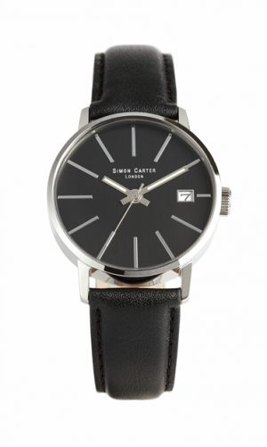 On trend, popular black faced smaller diameter watch. Understated design with baton indices and a subtly brushed finish to the dial. Case diameter is 35mm, case depth is a generous 10mm, genuine leather padded and ‘Simon Carter’ branded strap is 18mm wide