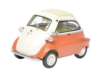 This BMW Isetta Diecast Model Car is Orange and Beige and has working wheels and also comes in a display case. It is made by Schuco and is 1:43 scale (approx. 5cm / 2.0in long).