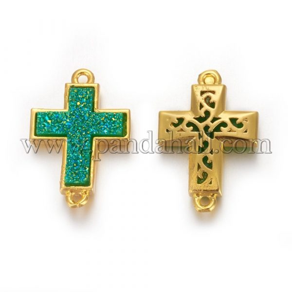Brass Links/Connectors, with Druzy Resin, Golden Plated Color, Cross, SeaGreenSize: about 13.5mm wide, 19.7mm long, 3.5mm thick, hole: 1.2mm