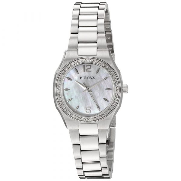 This exquisite ladies Bulova Diamond Gallery watch has a stainless steel case and is fitted with a quartz movement. It has a mother of pearl dial, a diamond set bezel and fastens with a stainless steel bracelet