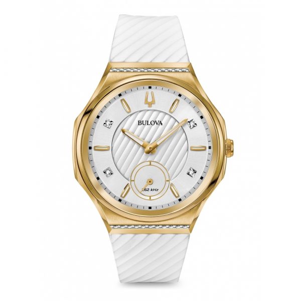 Item Shape – Round Dial window material type – Sapphire Display Type – Analogue Clasp – Buckle Case material – Gold Tone Stainless steel Case diameter – 40.5 mm Case Thickness – 10 mm Band Material – Rubber Band Length – Women’s Standard Band Colour – White Dial Colour – White Bezel material – Stainless steel Movement – High Performance Quartz Curv Water resistant depth – 30 Meters From the CURV Collection. Curved case, dial and proprietary movement features high-performance quartz technology with 262 kHz vibrational frequency for precise accuracy. 26 diamonds set on gold-tone stainless steel case and white dial with three-hand sub sweep, gold-tone hands and markers, exhibition case back, anti-reflective curved sapphire glass, screw-back case, white EPDM rubber strap with three-piece buckle closure, and water resistance to 30 meters. We are a Bulova UK authorised dealer Brand new boxed stock with full retail boxes & paperwork 3 year warranty