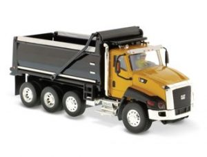 This CAT CT660 Dump Truck Diecast Model Truck is Yellow and Black and features working dump box, wheels. It is made by Diecast Masters and is 1:50 scale.