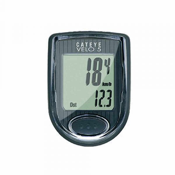 Cateye Velo 5 Cycling ComputerThe Velo 5 is CatEye’s entry-level computer. It features a new, larger screen and a large button for easy operation. Like all CatEye’s computers, it is ultrasonically welded and highly water resistant. The universal bracket and sensor mounts allow the Velo 5 to mount nearly any handle bar and fork. Functions Current speed Maximum speed Total Distance Trip distance Clock Features Auto start/stop Auto power-saving mode Tire setting in inches and CM Speed Display up to 300 kph/185mph New tool free universal mount ( 22 to 32mm diameter)Specifications Handlebar mount size: 22-32mm Fork mount size: 11-55mm Battery: CR2032