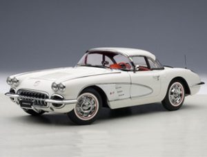 This Chevrolet Corvette (1958) Diecast Model Car is Snowcrest White and features working steering, suspension, wheels and also opening bonnet with engine, doors. It is made by AUTOart and is 1:18 scale (approx. 24cm / 9.4in long).
