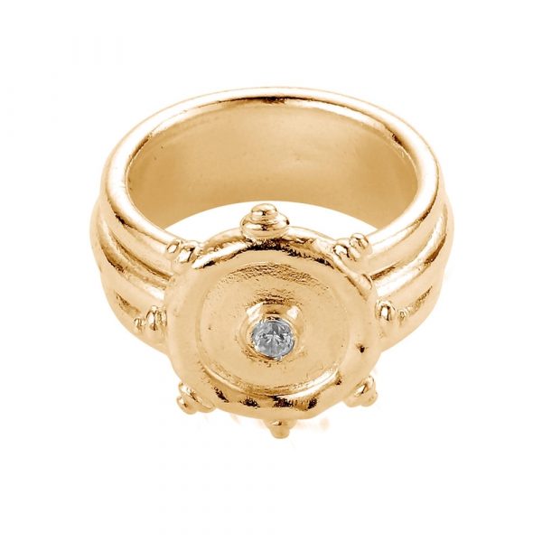 PRODUCT CODE – GRWHEEL21020 MATERIAL – Gold Tone 925 Sterling Silver SIZE – UK Sizes O Inside Diameter 17.35 mm WARRANTY – Faulty products will be replaced under your 12 month warranty, any accidental damage / breakage can be repaired at a small charge. For instant strength and style, get the bold, Wheel of Life Ring. A solid gold plated 925 sterling silver ring featuring a cubic zirconia stone, is based on the gothic architecture found around Venice and can be worn day to night, for a statement look.