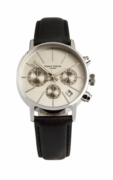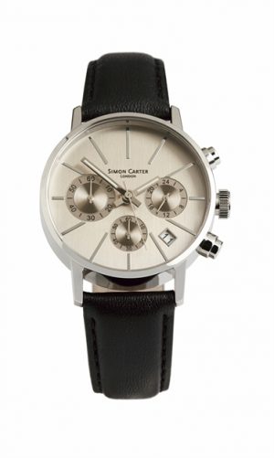 Trendy silvery faced smaller diameter chronograph with three inner dials for event timing up to a maximum of 60 minutes, plus 24 hour clock. The bottom dial measures event seconds, the top left dial measures event minutes and the top right dial is the 24 hour clock. The main minutes and hours hands are luminous and the main seconds hand is extremely fine and needle-like. It has a date window too. Case diameter is 35mm, case depth is a generous 10mm. Genuine ‘Simon Carter’ branded padded leather strap is 18mm wide. Water resistant to 3ATM