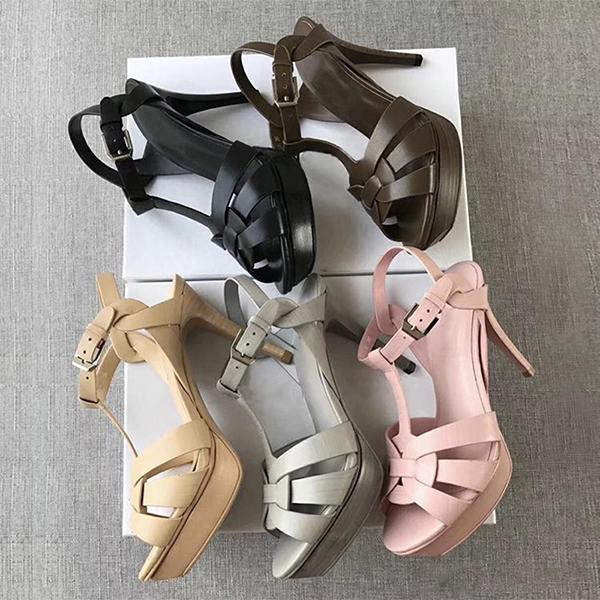 high heel stiletto sandals with intertwining straps adjustable ankle strapengraved buckle and beveled platform 10cm and 14cm platform height 1,6 inches