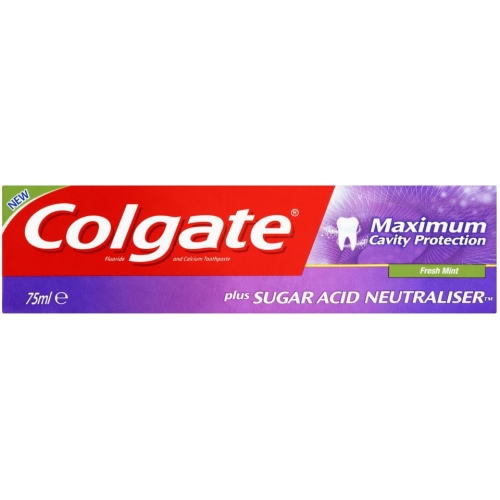 Colgate Maximum Cavity Protection plus Sugar Acid Neutraliser ToothpasteColgate Maximum Cavity Protection plus Sugar Acid Neutraliser Toothpaste directly fights sugar acids in plaque, the number one cause of cavities, and has been shown in clinical research to provide almost double the protection against early decay compared to a standard 1450ppm fluoride toothpaste.Colgate Maximum Cavity Protection plus Sugar Acid Neutraliser Toothpaste is clinically proven to fight tooth decay in two ways:The patented Sugar Acid Neutraliser helps de-activate sugar acids in plaque before they can harm teeth.It also contains fluoride and calcium, to strengthen and remineralise the enamel to help prevent cavity formation.Colgate Maximum Cavity Protection plus Sugar Acid Neutraliser Toothpaste is a delicious fresh mint flavour.
