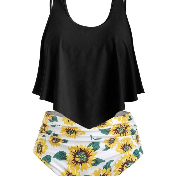 Contrast Overlay Sunflower Plus Size Tankini Set