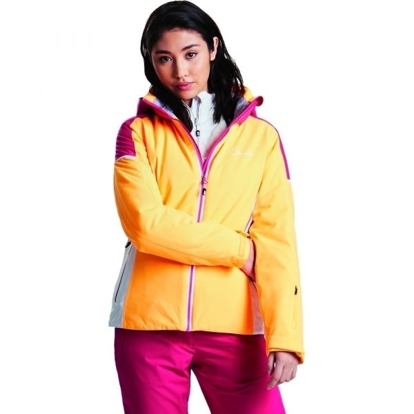 The Dare 2b Women’s Contrive Ski Coat is constructed from waterproof and breathable ARED VO2 20 000 fabric. This has lightweight high loft polyester insulation with scrim back panel. It features fixed foldaway hood with adjusters and a detachable snowskirt that prevent snow from entering inside and has two lower zip pockets one ski pass pocket with invisible zip and two internal mesh pockets with lens wipe cloth., Waterproof and breathable Ared V02 20000 Oxford polyester 4-way stretch fabric. Durable water repellent finish. Taped seams., Fixed foldaway hood with adjusters. Articulated sleeve design. 2 x lower zip pockets., 1 x ski pass pocket with invisible zip. Adjustable cuffs. Adjustable shockcord hem system., High loft polyester insulation. Polyester lining with scrim back panel. Fixed snowskirt with gel gripper tape., 2 x internal mesh pockets incl. lens wipe cloth.