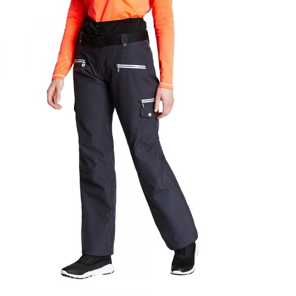 Wear the Dare 2b Women’s Liberty Trousers whenever you go skiing. These bottoms have an articulated knee design which allow your legs to move freely. The trousers are made with high loft polyester which is comfortable and provides room for breathability. It is both waterproof and durable which makes it suitable to wear during monsoon. The internal snow gaiters in these trousers prevent snow from entering inside., Waterproof and breathable Ared V02 20000 polyester 4- way stretch fabric., Durable water repellent finish. Taped seams. High loft polyester insulation. Warm touch lining to upper legs., High waist design with snap fastenings and removable webbing belt., Articulated knee design. Reinforced binding at hem., Tab up hem. Integral snow gaiters.
