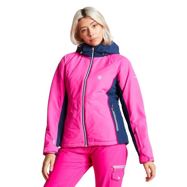 The Dare 2b Women’s Thrive Jacket is made with high loft polyester. It keeps you warm and protected during the cold weather conditions. With a fixed snowskirt the jacket prevents snow from affecting you. It is waterproof and breathable which makes the jacket a perfect apparel for skiing. It has 2 lower zip pockets to keep your belongings securely. It also has a zip pocket to keep your ski pass safe., Waterproof and breathable Ared 10000 coated polyester dobby fabric. Durable water repellent finish. Taped seams., Fixed foldaway hood with adjusters. 2 x lower zip pockets. 1 x ski pass zip pocket., Adjustable cuffs. Adjustable shockcord hem system. High loft polyester insulation., Polyester lining with scrim back panel. Fixed snowskirt with gripper tape. 2 x internal mesh pockets incl. lens wipe cloth.,
