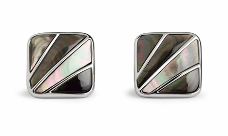 Art Deco fascinates me in its forward-looking effort to push natural features towards abstraction, as here, in a design of delicate radiating ribs, recalling perhaps the spreading veins of palm leaves, yet regular and formal in execution, with an infill of grey mother of pearl – of the three dyed variants I use, the one which displays the greatest range of iridescent effects, shimmering and refracting a range of subtle hues. An elegant and opulent cufflink, like the era that inspired it.