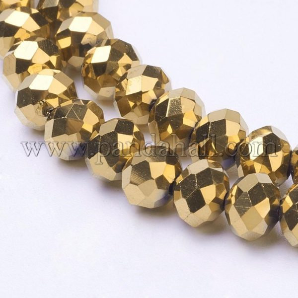 Electroplate Glass Bead Strands, Faceted, Rondelle, Golden PlatedSize: about 6mm in diameter, 5mm thick, hole: 1mm; about 100pcs/strand, 17.7″.These glass beads have been electroplated metallic color on their surface which seems to be shiny and colorful. Electroplated glass beads are gaining popularity attributed to their affordable and gorgeous advantages.