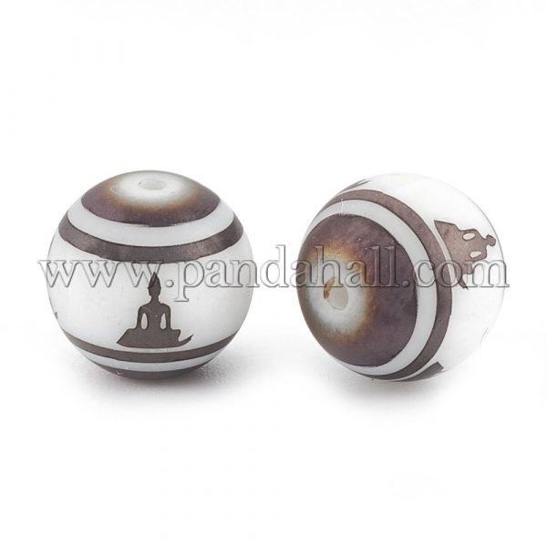 Electroplate Glass Beads, Frosted, Round with Sit in Meditation Pattern, Gunmetal PlatedSize: about 10mm in diameter, 9.5~10mm thick, hole: 1.2mm; 168pcs/box; packing: 7.4x13x2.5cm.
