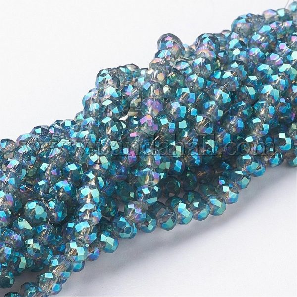 Electroplate Glass Beads Strands, Faceted Rondelle, TurquoiseSize: about 4mm in diameter, 3mm thick, hole: 1mm; about 140pcs/strand, 16.5″.Colorful glass beads with plated appearance creates wonderful light reflection. The decent designs make them a popular choice for whimsical jewelry. It can be matched with pins and jumprings, to make bracelets, necklaces or earrings.