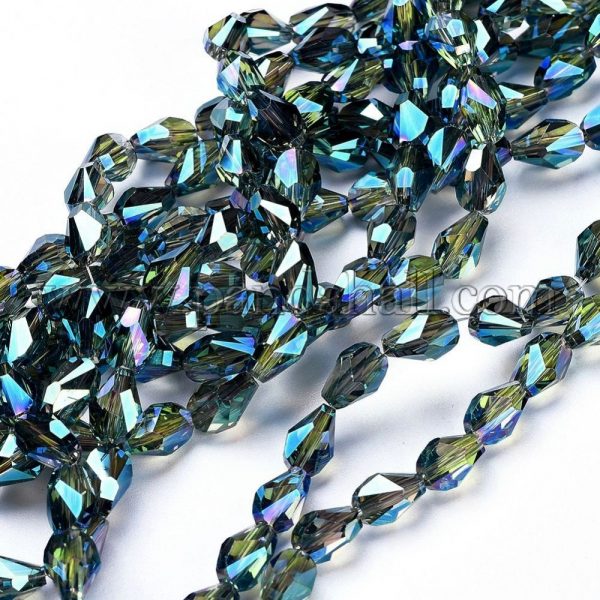 Electroplate Glass Beads Strands, Full Rainbow Plated, Faceted, Teardrop, DarkGreenSize: about 6mm wide, 7.5mm long, 4mm thick, hole: 1.2mm; about 80pcs/strand, 22.8″(58cm).