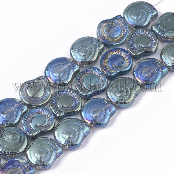 Electroplate Glass Beads Strands, Spiral Shell Shape, CadetBlueSize: about 12mm long, 11.5mm wide, 4.5mm thick, hole: 1mm; about 50~51pcs/Strand, 24.41”(62cm).