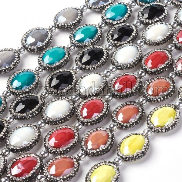 Electroplate Glass Beads Strands, with Rhinestone, Faceted, Oval, Mixed ColorSize: about 16~16.5mm wide, 19~20.5mm long, 7~7.5mm thick, hole: 1mm; about 9pcs/strand, 8.7″(22.1cm).