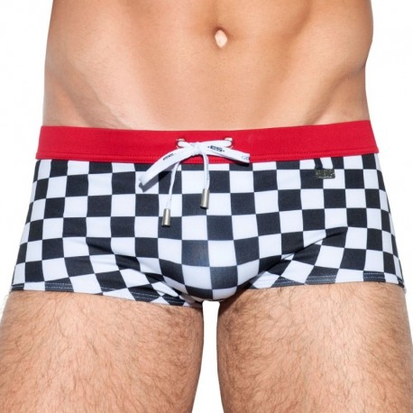 Sexy swim boxer made from comfortable and resistant microfiber. Low-rise and perfectly fitted cut. Original and trendy checkered pattern. Removable Pack Up System. Branded drawstring. Made in Barcelona.