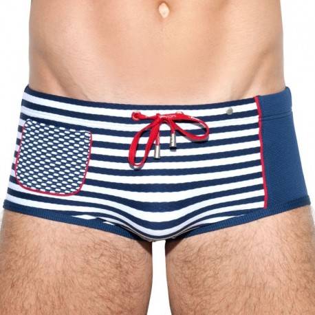 Sexy swim boxer made from resistant and comfortable microfiber. Low-rise and perfectly fitted cut. Sailor stripe and little pocket on the front. Removable Pack Up System. Elastic waistband with branded drawstring. ES Collection silicone logo. Made in Barcelona.