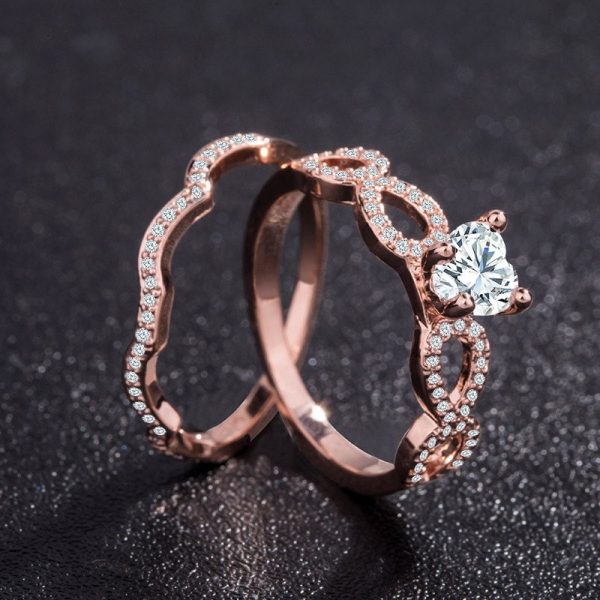 Exquisite Fashion 18K Rose Gold Heart Diamond CZ Ring Set Bride Wedding Rings