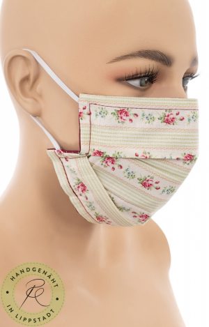2-colour cloth mask. 2-ply with practical rubber bands. This temporary mask is made of high-quality traditional costume fabrics and handmade with lots of love for you. The design is highly reliable and practical, since it is easy to use and store. The elastic bands guarantee an easy putting on and taking off of the mask. The high-quality dirndl fabric is made of 100% pure cotton. That means it is tightly woven, but breathable at the same time. The fabric mask is slightly open at the top so you can add an additional layer for optimal protection. This can then be replaced, and you can wear the fabric mask for longer. The face covering is made with different fabrics on the front and back. This allows you to match it with your outfit and colour coordinate as you like… if you already have a fabric mask, then you can make it more beautiful and as unique as you like, using one of these mas…