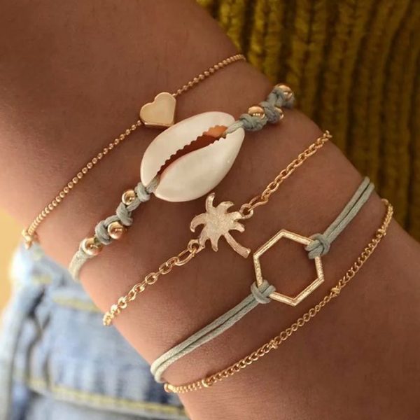 Five-piece Heart Cowrie Shell Palm Tree Chain Bracelet Set