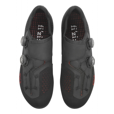 The ultimate racers shoe designed with and ridden by some of the best riders in the world.Following on from the success of the R1B shoe launched in 2016 the R1 Infinito takes fit to a whole new level. The volume control toe box combined with dynamic arch support means you have a show which conforms to your foot giving real comfort whilst the uni directional carbon fibre sole provides stiffness and power transfer.The R1 Infinito’s Microtex upper is hard-wearing, light, and resilient with enough flexibility to ensure comfort for every rider’s foot, but strong enough to withstand the demands of racing – without any weight penalty. The diamond-shaped laser-cut perforations help temperature management and breathability.The ultimate racers shoe designed for riding in hot weather with ultimate breathability.Following on from the success of the R1B shoe launched in 2016 the R1 Infinito takes fit to a whole new level. The volume control toe box combined with dynamic arch support means you have a show which conforms to your foot giving real comfort whilst the uni directional carbon fibre sole provides stiffness and power transfer.The knitted upper is highly breathable and comfortable yet retains stiffness where required.Volume control – the lower Boa controls toe box volume. The offset position means the front of the shoe wraps across the foot making it much more adaptable to different foot shapes.Dynamic arch support – the lower Boa also moulds the shoe to support the arch of the foot. The top Boa is then used to tighten the shoe to the foot.Uni directional, aerodynamic, vented carbon outsole with replaceable heel tab delivers power transfer through the pedals with ventilation to keep the feet cool on the toughest of climbs.Heel gripper on the inside of the shoe.Why use BOA?Glove-like fit: it provides custom comfort with smooth, even closure and no pressure points.Powerful closure: once locked into place, BOA reels and laces stay that way.Micro-adjustability: BOA reels offer seemingly infinite degrees of fine tuning.Quick on, quick off: BOA saves time when seconds count.On-the-fly adjustment: get easy, one-handed adjustment with a quick turn of the BOA dial.Durable: made from aircraft grade stainless steel, BOA laces are stronger per gram than tank armour.Lightweight: BOA closures shed water, mud and ice, shaving precious weight.Shoe specification:Adjusting the Boa closest to the toe will alter the fit and distributed pressure around the foot, enhancing comfort and performance.Adjusting the BOA dial will alter the fit of the heel cup around the foot, increasing power transfer and maximising performance.Full uni directional carbon fibre, aerodynamic ventilated outsole.Knitted upper for comfort and high breathability with reinforcement and stiffness in areas where strength and support is required.Double BOA IP1-B closure system (tri-modal: tighten, loosen and complete release)Neutral fit to accommodate the majority of foot shapesVolume control and dynamic arch support to give the ultimate fitFi’zi:k Cycling InsoleWeight: 232g (size 42.5)Colour: Black/Red