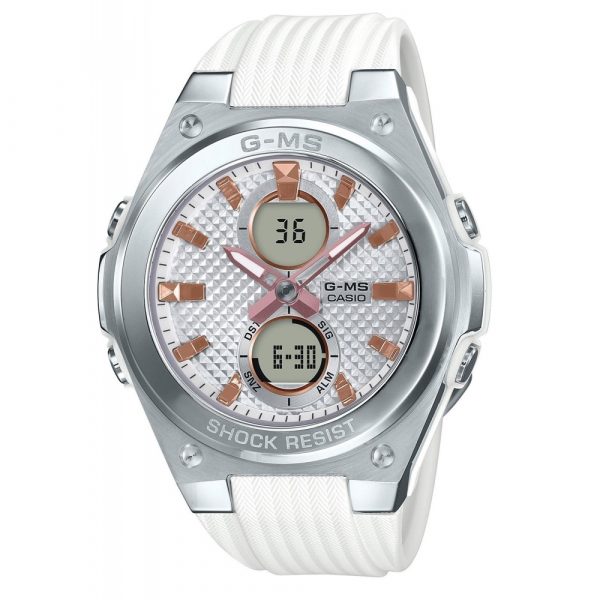 Super Illuminator At the touch of a button, the display can be brightly illuminated in a fashionable color Neo-display A luminous coating provides long-term illumination in the dark after only a short exposure to light. World time function Displays the current time in major cities and specific areas around the world. Stopwatch function – 1/100 sec. – 1 hour Elapsed time, split time and final time are measured with 1/100-sec accuracy. The watch can measure times of up to 1 hour. Timer – 1/1 min. – 1 hour For fans of precision: the countdown timers help you to remember specific or recurring events by giving off an audible signal at a preset time. The time can be set to the nearest minute and up to 1 hour in advance. 5 daily alarms The daily alarm reminds you about recurring events with an acoustic signal at the time you have set. This model has 5 independent alarms for flexible reminders of important appointments. Snooze feature Each time you stop the alarm, it sounds again after a few minutes. Automatic calendar with Date, Day and Month Once set, the automatic calendar always displays the correct date. 12/24-hour timekeeping Times can be displayed in either a 12-hour or 24-hour format. Mineral glass The tough mineral glass resists scratching. Stainless steel resin case Resin band Synthetic resin is the ideal material for wrist straps thanks to its extremely durable and flexible properties. Buckle Water resistance classification (10 bar) Perfect for swimming and snorkelling: the watch is water resistant to 10 bar according to ISO 22810. Dimensions (H x W x D) 45,1mm x 40,3mm x 12,4mm Weight approx. 40 g From the G-MS lineup of watches for the active and sophisticated woman of today comes a selection of cool models that incorporate studs into its design. Starting with a hefty case, stud-like cuttings for the 3, 9, and 12 o’clock hour markers and across the entire face are used to create a distinctive design. The bands of these models have a herringbone pattern finish, which makes the resin material resemble fabric for a classical feel. These models are available in a choice of bezel colours: the refreshingly feminine rose gold tone of the MSG-C100G and the cool silver of the MSG-C100. Function-wise, these models feature tough shock resistance and 100-meter water resistance to support the lifestyle of the active woman of today. The face has a pair of digital displays that show the current date, day of the week, World Time information, and more.
