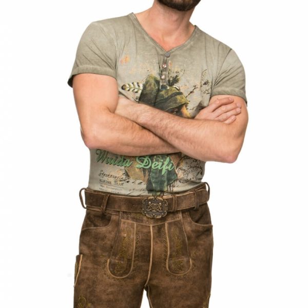 Aron brown leather trousers with belt. These authentic Bavarian leather shorts boast state-of-art style and sophistication. They feature two pockets on the front sides, which compliment the requirements of a classic Oktoberfest, while light-brown piping on the button-up bib provides extra definition. The light-yellow embroidery helps to create the classic look, while the green lacing on the cuffs ensures eye-catching appeal.